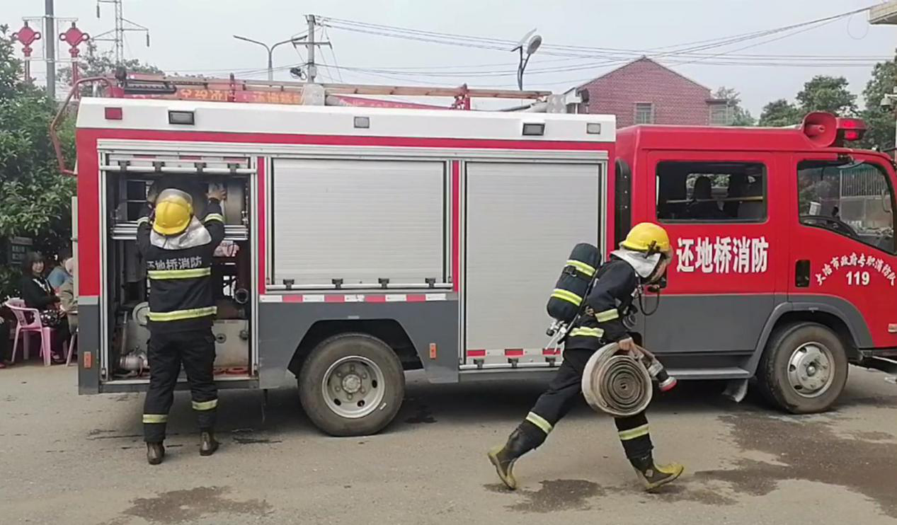 9:30时,区·镇还桥村应急指挥部发出火灾警报信号,驻留村委会的群众用湿毛巾捂紧口鼻紧急疏散,消防队接警后立即赶到现场,接驳消防栓实施灭火救援,整个演练过程安排周密,疏散有序,配合默契,达到了疏散演练的要求。