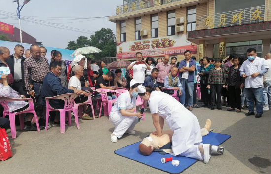 9:45时,区·镇卫生院接到120急救电话,立即组织医疗急救人员赶到事发现场,对突发心脏病的模拟病人实施现场急救,卫生院医护人员现场操作了心脏复苏双手交叠按压、人工呼吸等急救措施,并详细向观摩人员讲解了操作流程。