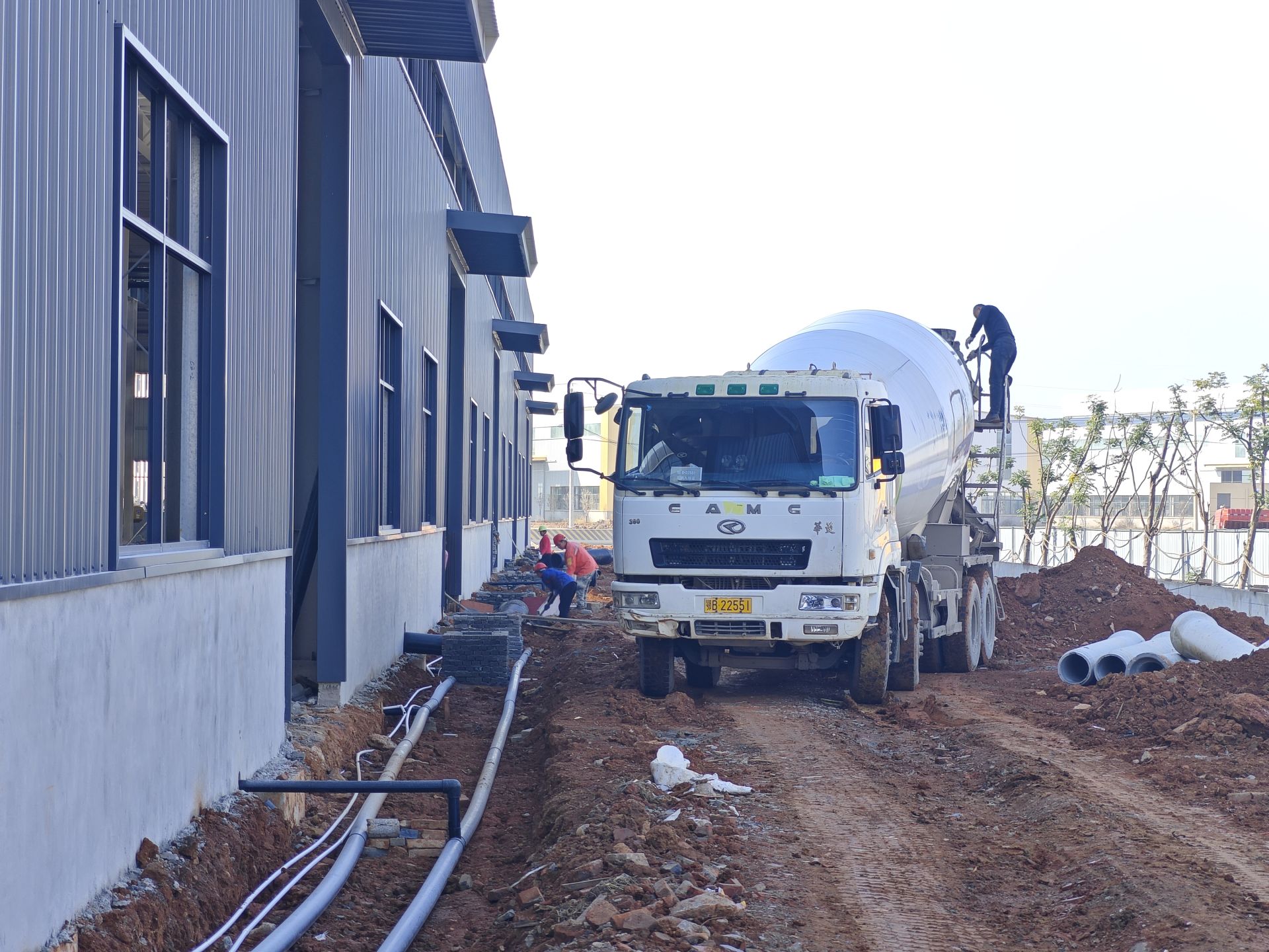 9日,在临空区·还地桥镇下堰村,湖北宇骞冷链物流有限公司项目正在如火如荼地建设中。工人们抓紧时间填埋污水管道、贴地砖。
