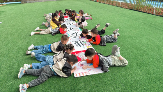 大草坪上,一张巨大的白色画纸缓缓铺开,一场充满爱与创意的“集体画中国”活动温馨上演。“我要给‘中国’穿上红衣服,就像国旗一样鲜艳!”孩子们或跪或趴在画纸上,有的专注涂色,有的创意画小花。不一会儿,原本空白的画纸便变得色彩斑斓——“我爱你中国”五个大字被鲜艳的花朵、闪烁的星星与可爱的小房子环绕,满是童真与对祖国的热爱。