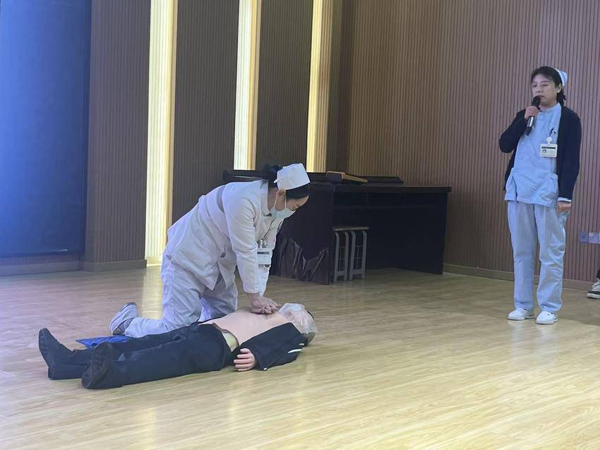 为增强培训的实操性与直观性,还地桥中心卫生院外妇科医生吴焕、急诊科护士黄薇及外妇科护士长曹昼共同进行了现场技能演示。演示内容包括海姆立克急救法、单人徒手心肺复苏以及自动体外除颤器(AED)的操作使用流程,以及外伤包扎技术,使参训人员对关键急救技能有了更深刻的理解。