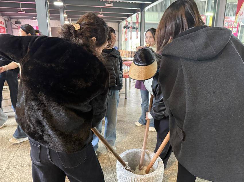 随后,大家走进田间地头,体验采摘野菜的乐趣。荠菜、野葱……姐妹们一边辨认一边采摘,仿佛回到了童年时光。在民俗体验区,大家围坐在一起,亲手制作野菜粑粑;另一边,木槌起落间,热气腾腾的糯米被打成软糯香甜的糍粑,咬上一口,满是乡愁与温情。