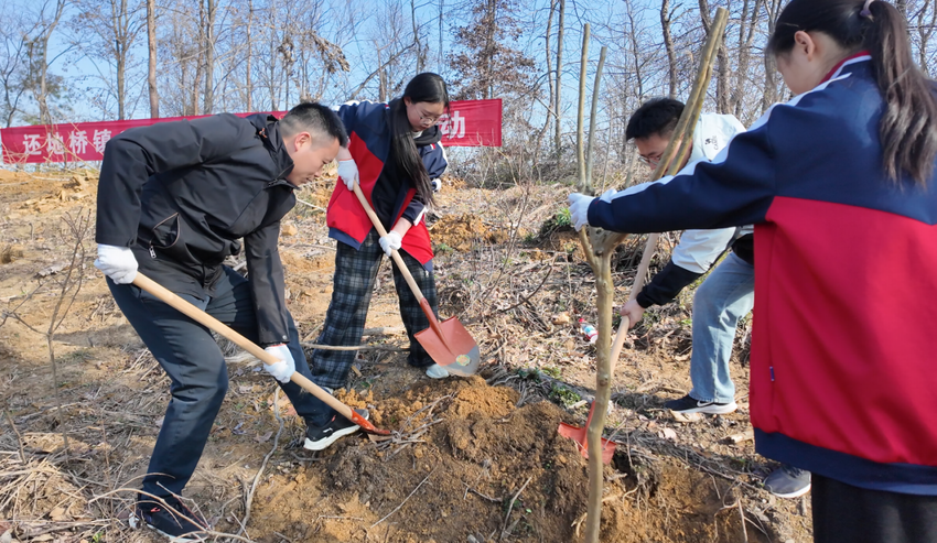 上午8时30分许,参与植树的干部职工和学生代表统一乘车抵达现场。春风拂面,大家手持铁锹、锄头,分工协作,配合默契。挥锹挖坑、扶苗培土、提水浇灌,每一道工序都一丝不苟,现场井然有序,热火朝天。三五成群的学生们小心翼翼地将树苗植入土中,认真浇水,稚嫩的脸庞上写满对绿色的向往。来自还地桥镇实验学校的陈锦绮同学兴奋地说:“今天能参加植树活动,我觉得特别有意义,不仅亲手种下了树苗,更感受到了保护环境的重要性。”